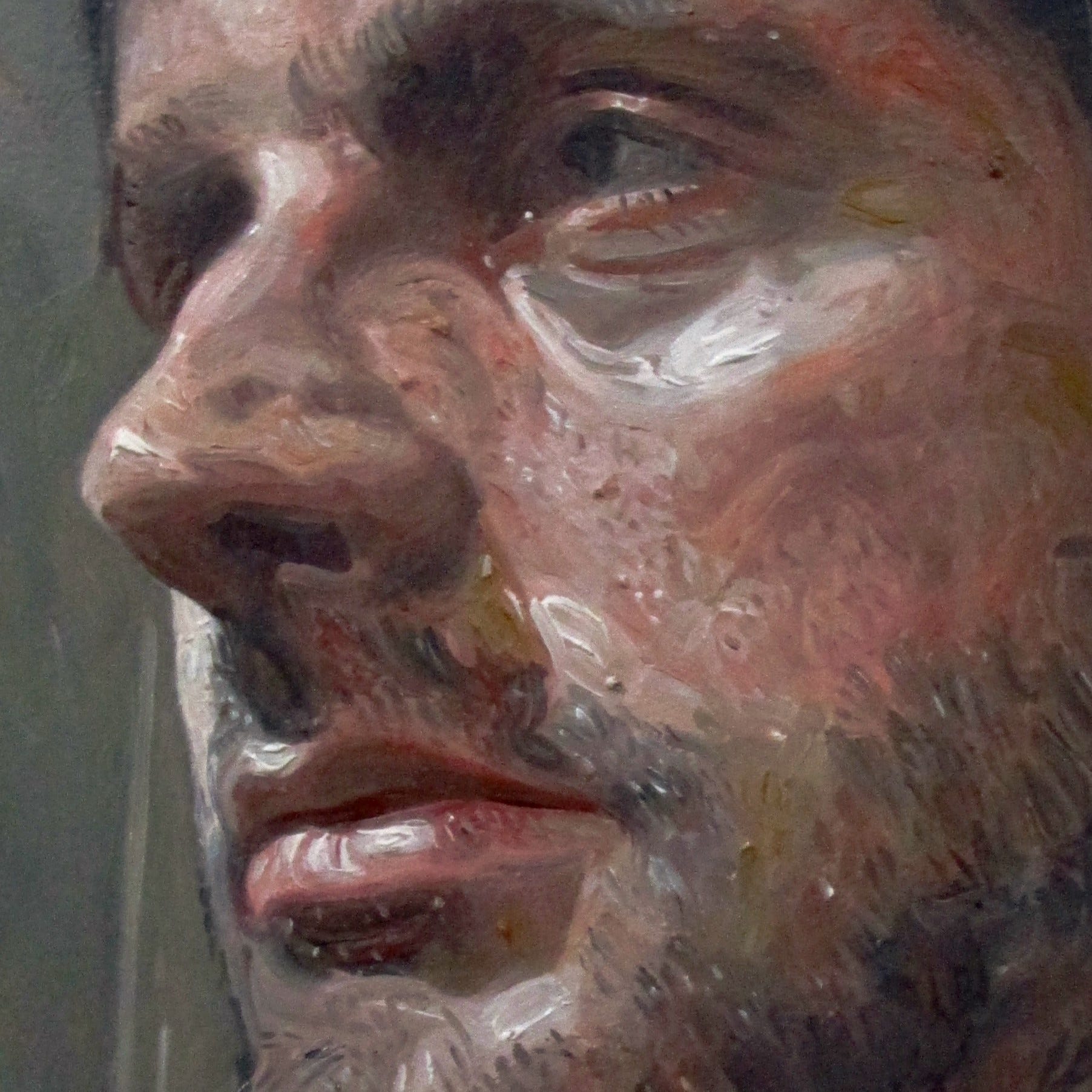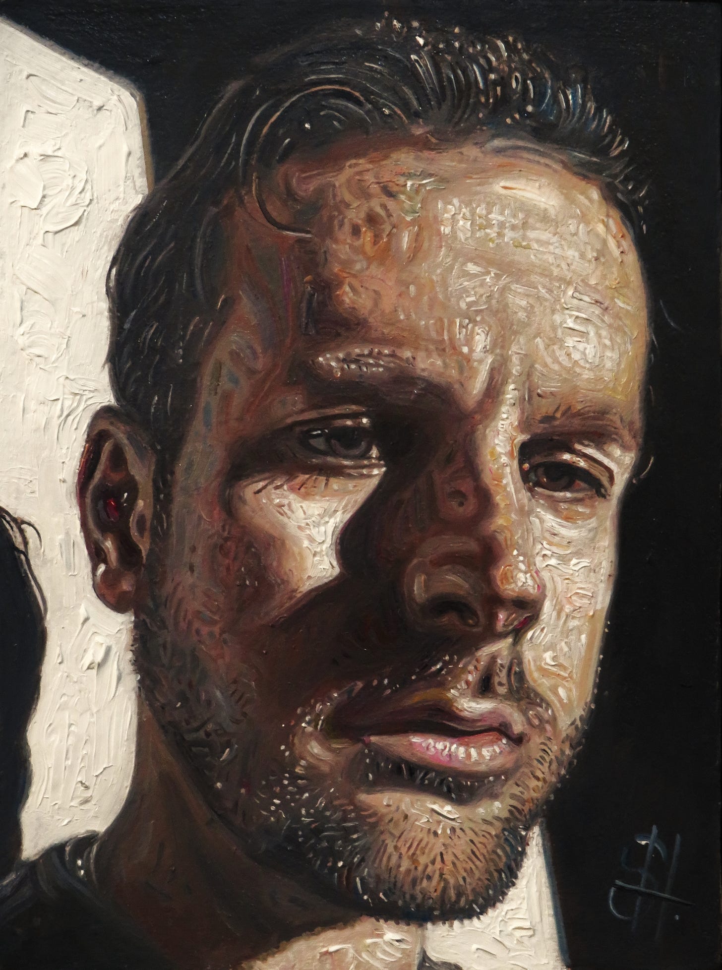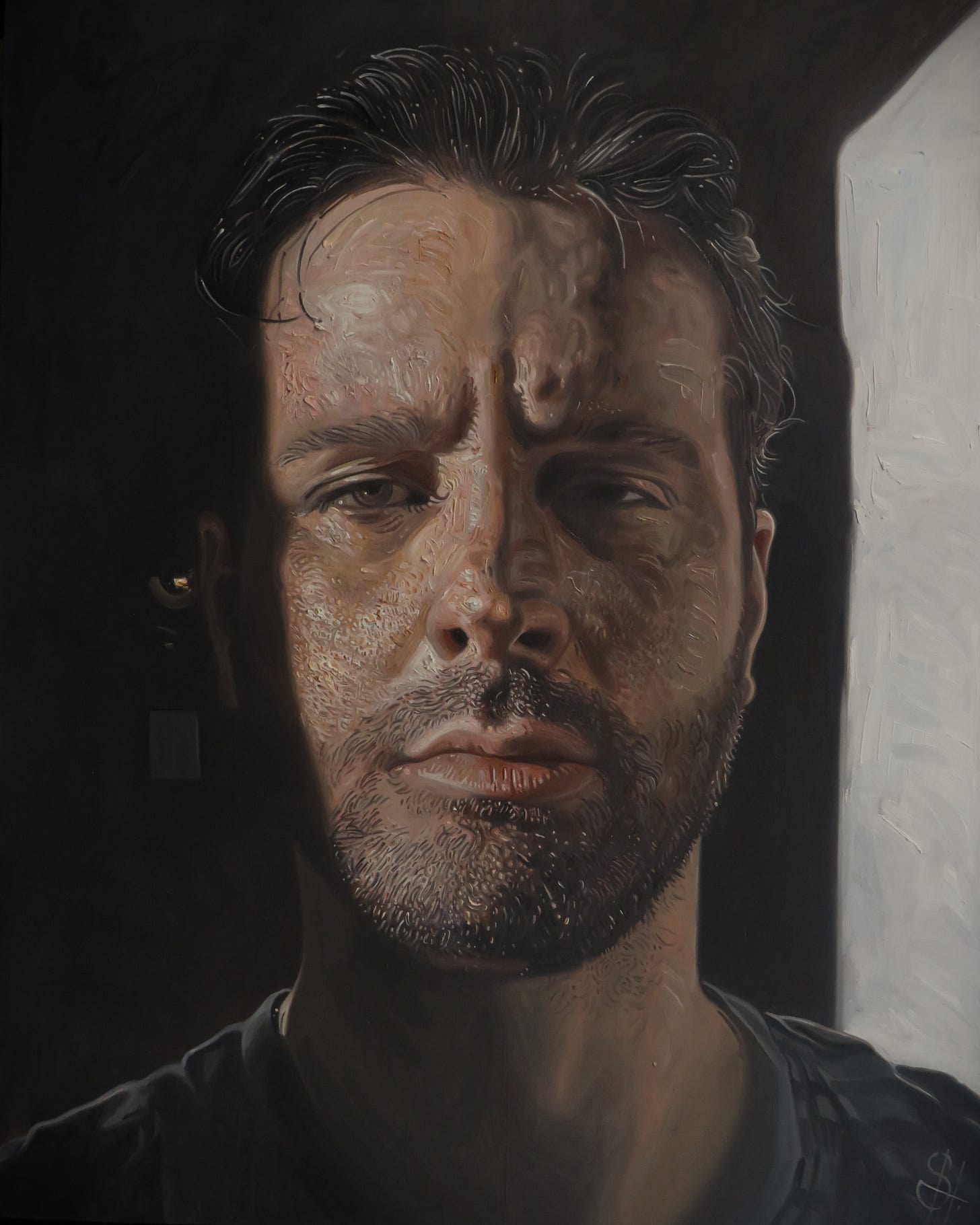 I love working with interesting plains of light and shadow within my portrait compositions. This can be achieved by using sunlight through window blinds, railings and trees cast across the face. Not only can this element bring an extra narrative layer but can allow me to really shovel the paint on in the highlights. I noticed painters like Rembrandt and Van Dyke really go to town with the paint application on the main highlights so it’s always good to take influence from other work that inspires.