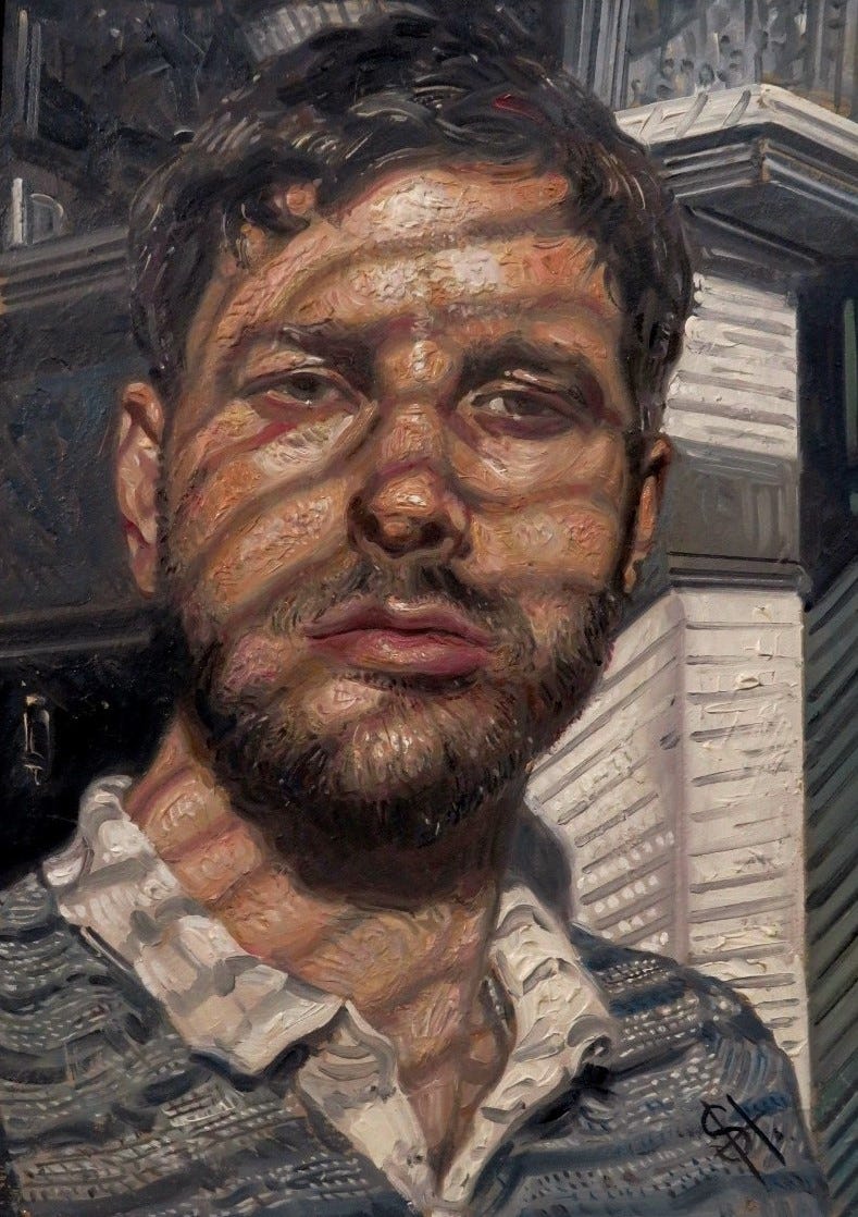 In this painting 'Self Portrait, Summer Light', I decided to use a palette knife in the initial underpainting stages. In the priming stage I mixed some thicker gesso and glue, then applied it as if sculpting the form. In the the painting stage I applied thick paint with a knife. I only then decided to use brushes — almost like working backwards. I had to work within the contours of the impasto marks that I initially made and therefore could not be too fiddly. I had to be bold with my brushstrokes. I think the outcome was positive and this piece ended up being full if life.